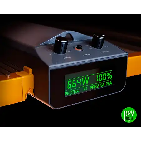 C'est un panneau de barres, avec une structure qui mesure 110 x 115 x 4 cm et pèse 13 kilos, mais il peut éclairer une zone de culture de 1,5 x 1,5 M (2,25 M2) ou jusqu'à 1,8 x 1,8 M (3,24 M2) Il contient 6 barres de 110w chacune et comme nouveauté il présente un écran LCD de 4,5 pouces où vous pouvez consulter différents paramètres. Autre nouveauté, il dispose d'une minuterie intégrée qui vous permet d'automatiser sa mise en marche et son arrêt, de sorte que vous n'avez pas besoin de connecter d'autres dispositifs de contrôle. Il dispose également d'un régulateur qui permet de choisir le spectre spécifique pour la phase de croissance végétative puis pour la phase de floraison, afin que les plantes reçoivent toujours le meilleur type de lumière.