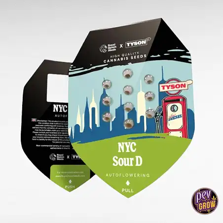 Les graines autofloraison NYC Sour D Auto - Tyson 2.0 X RQS, croisement entre NY Diesel et Sour Diesel Auto, offrent des plantes robustes, faciles à cultiver, avec une production allant jusqu'à 500 g/m², 21% de THC, et un goût intense de diesel. Effet énergisant et relaxant.