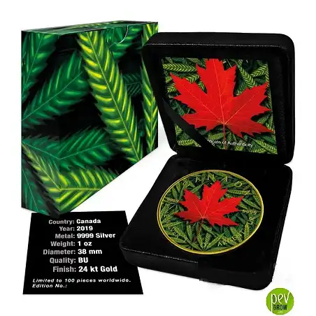 Cette incroyable pièce de 1 Oz (32 grammes) Argent est dédiée à la légalisation de la plante de cannabis au Canada.