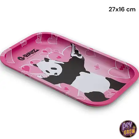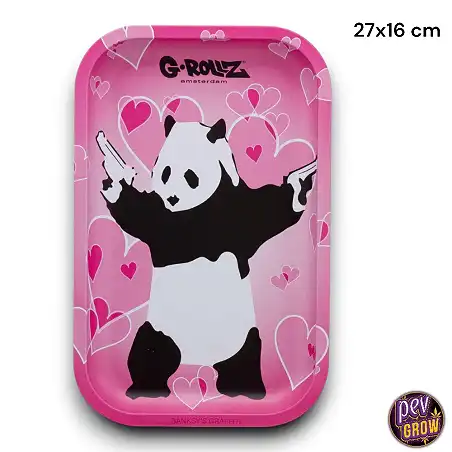 La G-Rollz Panda est un plateau en métal durable pour rouler des joints, avec un design de graffiti de Banksy sur fond rose. Compact et portable, il évite la perte d'herbe et facilite le processus de roulage.