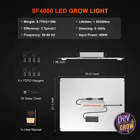 La Spider Farmer SF4000 mesure 64,8 x 53,6 x 5,9 cm et a un poids total de 8,76 kilos, elle est donc idéale pour l'éclairage des tentes de culture car elle peut être accrochée sans problème aux barres métalliques du plafond de sa structure. Sa puissance est plus que suffisante pour éclairer une zone de culture intérieure de 1,5 x 1,5 mètres en croissance végétative et de 1,2 x 1,2 mètres pendant la phase de floraison. Il intègre un total de 1212 diodes (Samsung LM301B+ IR diodes), qui ont une efficacité allant jusqu'à 2,7 umol/J, et peut atteindre un rendement en bourgeons allant jusqu'à 2,5 grammes par watt consommé. Cela signifie qu'avec une seule lampe de culture LED Spider Farmer SF4000, vous pouvez atteindre jusqu'à 1 125 grammes par récolte.