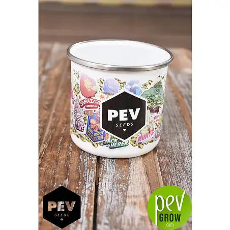 Tasse en métal Pev Seeds cylindrique, design rétro d'une contenance de 380 ml, en métal émaillé blanc, bord supérieur chromé argenté.