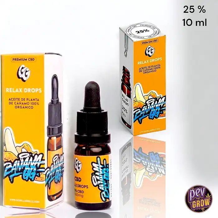 Gorilla Grillz ( Banana GG ) Aceite CBD 25% 10ml 2500mg CBD combina alta concentración de CBD y sabor a banana. Espectro completo para bienestar total, con base de aceite de coco y dosificación precisa gracias a su gotero.