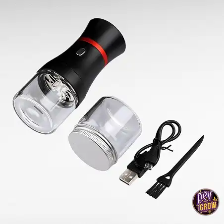 Este grinder de maría destaca por su diseño elegante y funcional. Viene en un sobrio color negro y está equipado con una cuchilla de acero inoxidable y un potente motor. Además, incluye un frasco de vidrio para almacenar las hierbas trituradas, lo que facilita su uso y transporte.