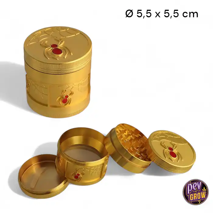Este no es un grinder cualquiera. Su diseño de araña grabado en la tapa le confiere un toque distintivo y misterioso, ideal para aquellos que aprecian la estética tanto como la funcionalidad. Con un diámetro de 55 mm, es el tamaño ideal para llevar contigo a todas partes sin sacrificar capacidad de molido. Su construcción en metal de alta calidad garantiza una resistencia excepcional y una larga vida útil, soportando el uso diario sin problemas.