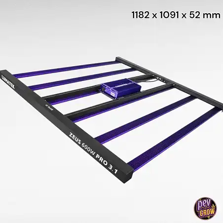 El pannello LED ZEUS Compact di Lumatek, con 6 barre magnetiche da 100W, è ideale per la coltivazione indoor di marijuana. Risparmia fino al 40% di energia, ha uno spettro completo, è regolabile e resistente all'acqua. Superficie: 1,5 x 1,5 m.