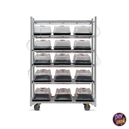 Con le sue dimensioni 135 x 56 x 190 cm, questo carrello è stato progettato pensando all'efficienza e al comfort. Dotato di cinque rack di coltivazione, ciascuno dotato di apparecchi a LED, questo carrello permette di massimizzare la produzione di talee e semi. A seconda del tipo di vassoio che scegli, puoi produrre tra 1.155 e 2.250 talee o semi, offrendoti un'ampia gamma di possibilità.