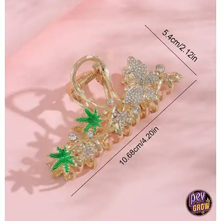 Questo fermaglio è stato pensato per catturare l'attenzione. Con le sue dimensioni di 11 x 5.5 cm, è abbastanza grande da fare la differenza, ma allo stesso tempo discreto per un uso quotidiano. Le farfalle e la foglia di cannabis, finemente lavorate e impreziosite da strass brillanti, creano un contrasto affascinante che si adatta a diversi stili. Realizzato con materiali resistenti, ti garantisce una presa sicura e duratura, mantenendo la tua acconciatura impeccabile per ore. È l'accessorio ideale per completare il tuo look, sia che tu stia andando a una festa o semplicemente desideri aggiungere un tocco speciale al tuo outfit quotidiano.