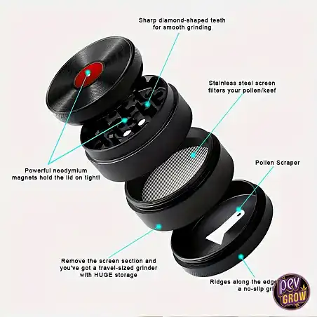 Questo grinder non è un semplice macinino; è un omaggio all'estetica senza tempo del disco in vinile, trasformato in uno strumento pratico e robusto. Realizzato in metallo resistente, probabilmente una lega di zinco o alluminio, ti assicura durabilità e una presa solida. La sua struttura a 4 parti è pensata per offrirti il massimo della funzionalità: una camera di macinazione con denti affilati per sminuzzare le tue erbe alla perfezione, un filtro a rete per separare il polline e una camera inferiore dedicata alla sua raccolta.