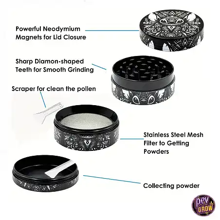 Scegliere il Grinder Metallo Stich Nero significa optare per precisione, durabilità e stile. Dimentica le forbici appiccicose e le dita sporche; con questo grinder, otterrai una macinatura perfetta in pochi secondi. I suoi denti affilati a forma di diamante garantiscono una triturazione uniforme, preservando al meglio gli aromi e le proprietà delle tue erbe. Inoltre, la sua struttura a 4 parti include un pratico raccoglitore di polline, permettendoti di non sprecare nulla e di godere appieno di ogni parte delle tue erbe.