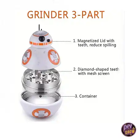 Questo grinder è fantastico! Il design BB8 è super originale e macina l'erba alla perfezione. Lo porto sempre con me, è robusto e il raccoglitore di polline è un plus.