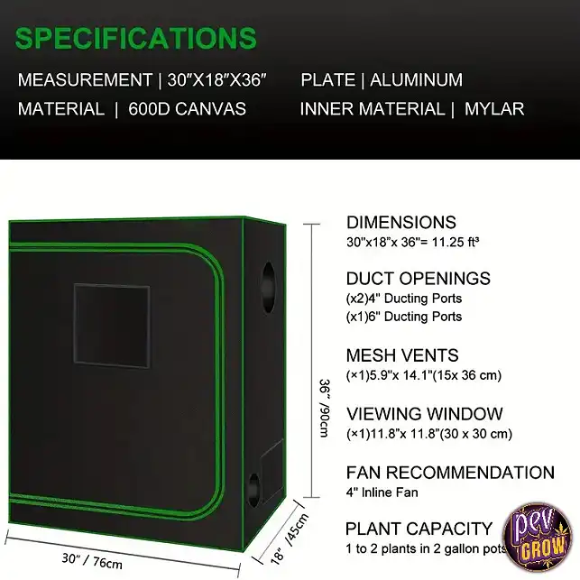 Questa grow box si distingue per la sua costruzione robusta e le sue funzionalità pensate per il coltivatore moderno. Il tessuto esterno in Oxford 600D assicura durata e resistenza, mentre il rivestimento interno in Mylar ad alta riflettività massimizza l'efficienza luminosa, dirigendo ogni raggio verso le tue piante. Le dimensioni di 76x45x90 cm la rendono ideale per spazi ridotti, senza compromettere la capacità di crescita. Inoltre, la pratica finestra di osservazione ti permette di monitorare le tue piante senza disturbare il microclima interno, e la vasca di raccolta in Mylar rimovibile facilita la pulizia e previene fuoriuscite d'acqua. È un pezzo essenziale della tua attrezzatura per coltivazione.