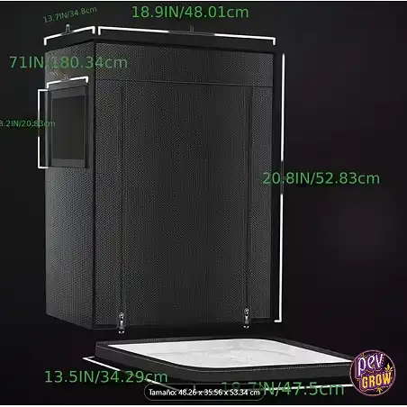 Questo mini armadio è stato pensato per offrirti il meglio in termini di funzionalità e durata. Le sue dimensioni di 48x35x53 cm lo rendono estremamente versatile. È dotato di aperture per la ventilazione che garantiscono un ricircolo d'aria costante, fondamentale per prevenire ristagni e favorire un ambiente sano per le tue piante. La struttura è solida e facile da assemblare, garantendo stabilità e sicurezza per tutta la durata della coltivazione. Il telo esterno, resistente e opaco, assicura che la luce non fuoriesca, mantenendo la tua coltivazione completamente privata.