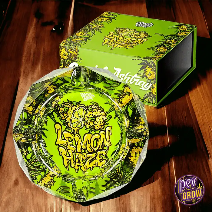 Il posacenere in vetro Best Buds con varie varietà di marijuana e scatola regalo si distingue per il suo design unico e accattivante. Ha una forma rotonda con un diametro di 11 cm e una profondità di 2,5 cm, anche se per il disegno può sembrare più un ottagono. Questo posacenere offre ampio spazio per posizionare in modo sicuro la tua sigaretta. Inoltre, dispone di 4 tacche o intagli strategicamente posizionati che ti permettono di poggiare la tua canna tra una calata e l'altra, evitando che si spenga prematuramente. Ci sono 2 modelli diversi con design multicolore, il modello Sunset Sherbet rappresenta un gelato sciolto che si riposa sulla spiaggia mentre gusta la varietà Sunset Sherbet, offrendo un'estetica attraente e divertente, e il modello Lemon Haze mostra un bocciolo di limone che versa succo.