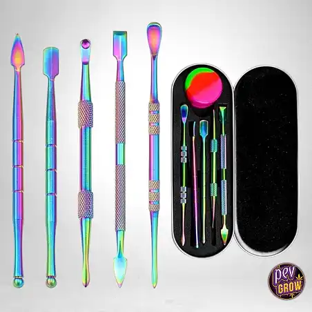 Il Kit Dabbers Acciaio Rainbow + Tappetino in Silicone si presenta come un'opzione fantastica per tutti gli amanti delle estrazioni e dei concentrati. Qui troverai 5 strumenti a doppia estremità, un barattolo in silicone da 0,2 fl oz e un trasporto in metallo, facile da portare, accompagnato da un tappetino in silicone di 15x15 cm che offre uno spazio sicuro e senza disordine per lavorare.