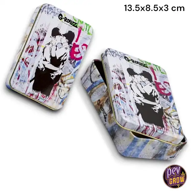 Scatolina Metallica G-Rollz Banksy 13,5x8,5x3 cm. Una piccola scatola di metallo che puoi trasportare in qualsiasi borsa, per portare le tue erbe protette con uno stile unico, poiché include un codice QR che attesta l'autenticità di questa piccola opera d'arte.