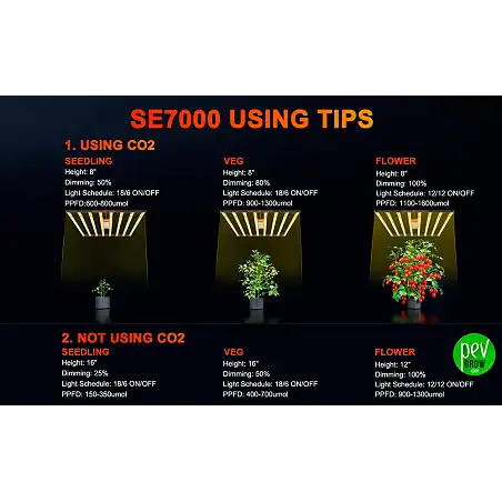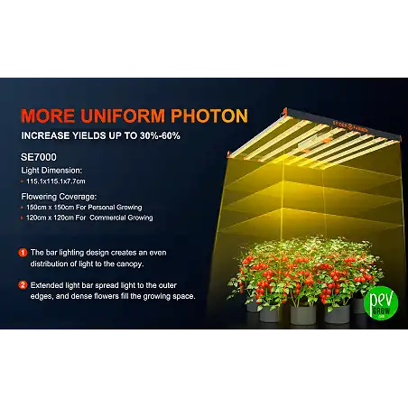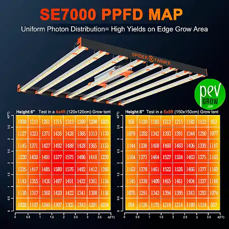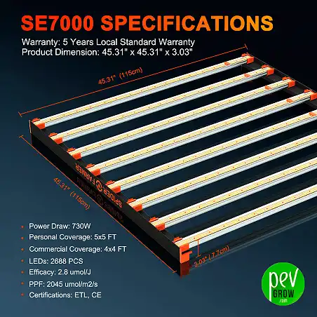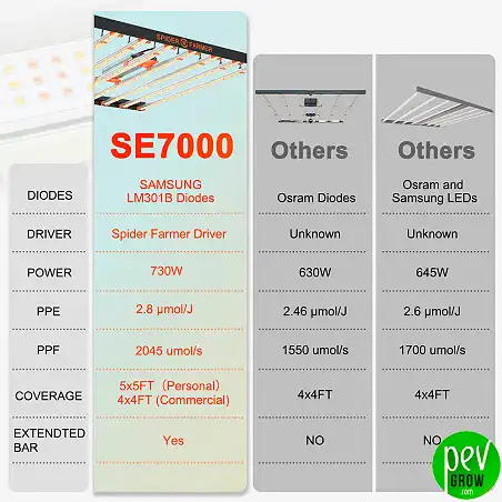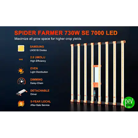 Spider Farmer SE7000 è la luce di coltivazione a LED di fascia più alta di questo marchio, una luce che raggiunge prestazioni spettacolari con un consumo energetico impensabile solo un paio di anni fa. Si tratta di un pannello di 8 barre LED che hanno un totale di 2688 diodi Samsung LM301B, che raggiungono anche un'efficienza di 2,8 µmol/j, il tutto con soli 730w di consumo. E' un sistema regolabile, permette di scegliere la potenza di luce che le piante ricevono in ogni fase della loro coltivazione, e questo facilita una crescita sana e vigorosa e una fioritura copiosa.