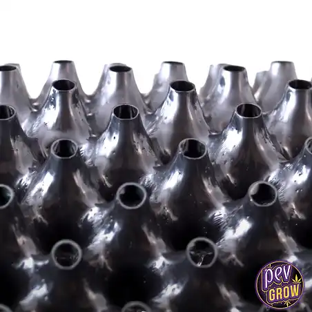 I vasi Air-Pot presentano una struttura circolare e sono costituiti da una parete forata che comprende coni chiusi all'interno e coni aperti all'esterno. Il suo design evita la presenza di superfici piane all'interno per prevenire la deformazione e l'arricciamento delle radici. In questo modo si garantisce che le radici non si deteriorino o si aggroviglino. I coni interni dirigono e guidano la crescita delle radici verso i coni aperti all'esterno. Una volta raggiunta l'esterno, l'aria ad alta densità disidrata e "taglia" le punte delle radici. Questo processo di potatura aerea stimola la formazione di numerose radici, permettendo uno sviluppo ottimale della pianta.