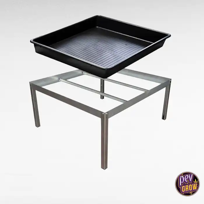 La bandeja de este kit mide exactamente 100 x 100 cm, fabricada con materiales de alta resistencia que son fáciles de limpiar y mantener. El soporte metálico, por otro lado, eleva la bandeja del suelo, lo que mejora la circulación del aire y facilita el manejo del sistema de riego. Su diseño es práctico y estéticamente agradable, lo que lo hace ideal para ser utilizado en diferentes tipos de espacios de cultivo, desde pequeños apartamentos hasta grandes invernaderos.