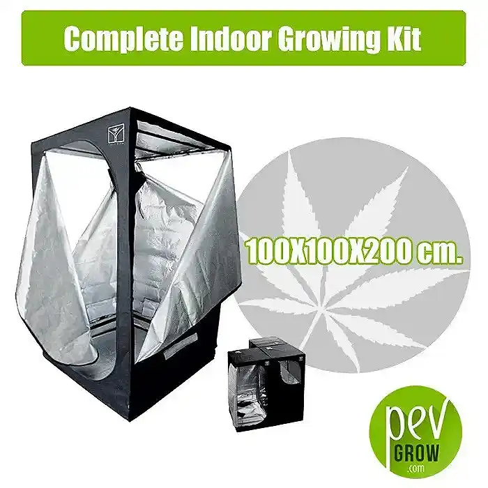 Nuestro kit con armario de 100x100x200 cm. es el más elegido por los auto cultivadores de marihuana. Tiene las medidas justas para cultivar 9 plantas medianas desde semilla o hasta 16 esquejes en Sea Of Green, aunque hay usuarios que prefieren cultivar 4 o 5 plantas grandes, eso lo decides tú.