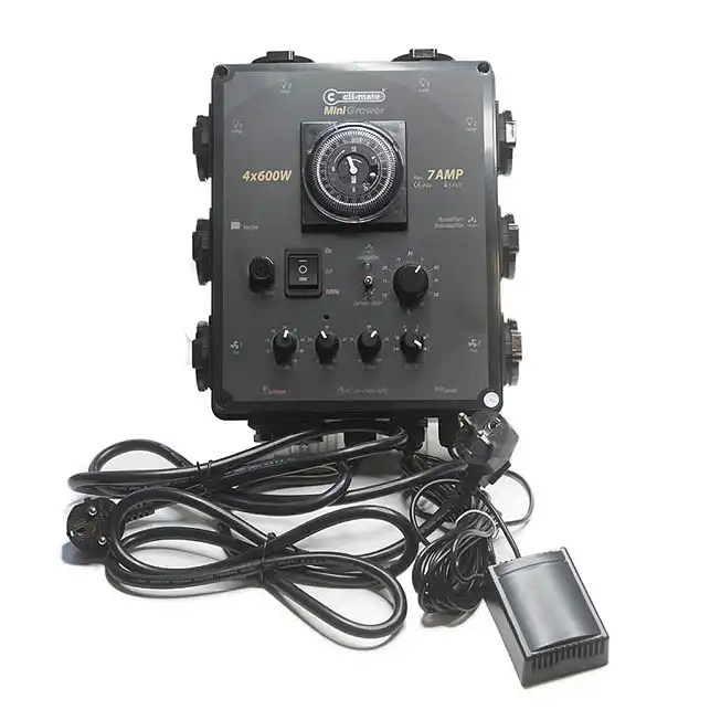 Cli-Mate Mini Controller 4x600w ir universāls vadības centrs, ko jūsu iekštelpu dārzs ir pelnījis – izstrādāts, lai pilnībā automatizētu apgaismojuma ciklus un ventilācijas intensitāti vienā izturīgā ierīcē. Tas ļauj pieslēgt līdz četrām 600 vatiem spēcīgām lampām un pārvaldīt izsūkšanas iekārtas atkarībā no temperatūras, nodrošinot stabilu, profesionāla līmeņa vidi bez nepieciešamības pastāvīgi uzraudzīt telpu.