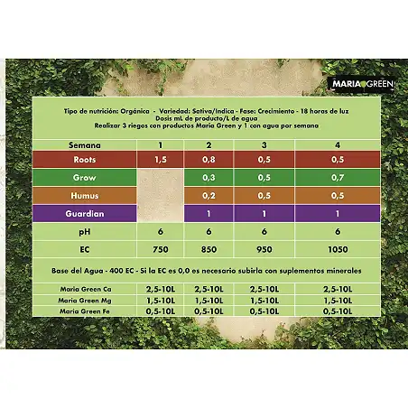 Pieredzējušam audzētājam Maria Green Grow piedāvā precizitāti un kvalitāti, kāda nepieciešama augstas izturības ģenētikai. Jūs zināt, ka laba veģetatīvā fāze ir 80% no panākumiem. Šis produkts ļauj jums uzturēt tīru substrātu, brīvu no uzkrātajiem sāļiem, kas bloķē barības vielu uzsūkšanos, maksimāli palielinot jūsu iecienītāko šķirņu ģenētisku izpausmi.