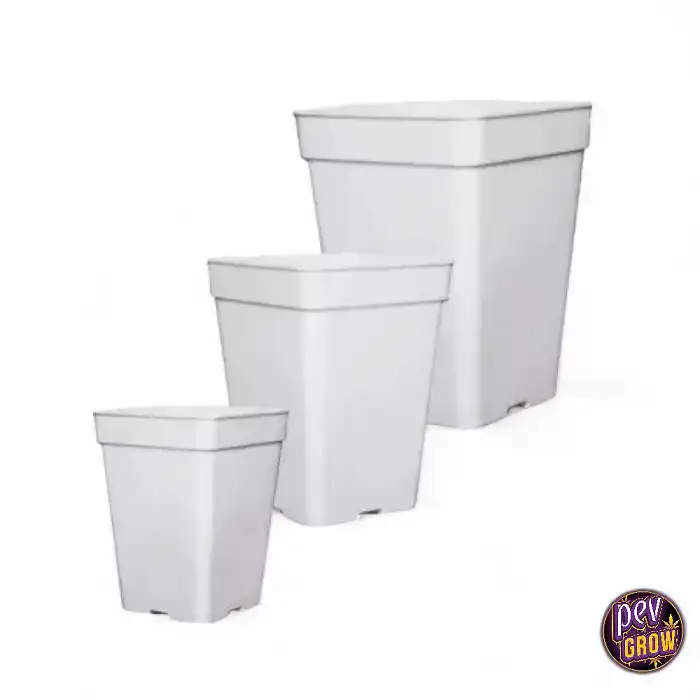 En Pevgrow, te ofrecemos la maceta cuadrada blanca en una amplia gama de tamaños para adaptarse a cada etapa de crecimiento de tus plantas. Desde pequeñas macetas de 0.25L para germinación y esquejes, hasta grandes formatos de 50L para plantas madre o cultivos de exterior de gran tamaño. Todas están fabricadas con plástico de alta calidad, garantizando durabilidad y resistencia a los rayos UV. Cuentan con un fondo elevado y múltiples orificios de drenaje, asegurando una correcta evacuación del exceso de agua y una óptima oxigenación de las raíces, previniendo problemas de encharcamiento.