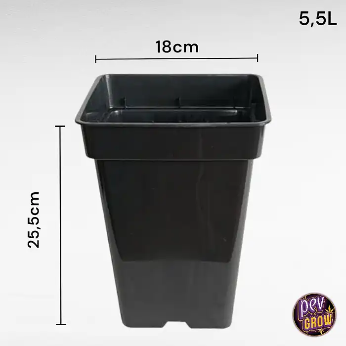 La maceta cuadrada negra de plástico de 5,5 litros (18x18x25,5 cm) de Pevgrow es perfecta para cultivadores que desean promover un crecimiento vigoroso. Su diseño alto y cuadrado permite un desarrollo radicular más profundo. Los usos de estas macetas baratas pero muy resistentes son múltiples, ya que se pueden utilizar como contenedor de crecimiento vegetativo con plantas grandes, o para cubrir incluso la floración en cultivos de esquejes en Sea Of Green, donde se ponen muchas macetas juntas con plantas poco desarrolladas. Utiliza el plato para macetas cuadradas de 20x20 cm para un manejo efectivo del agua y la humedad.