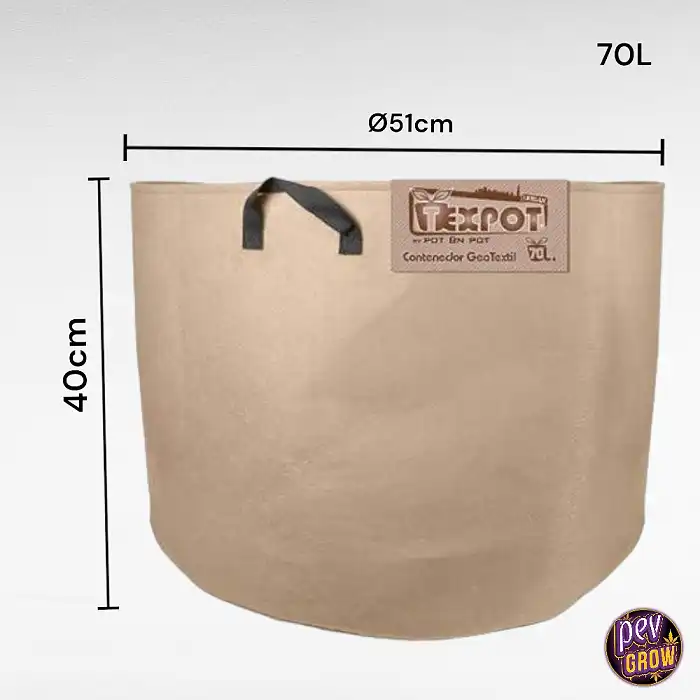 La maceta Tex Pot Urban color arena, con capacidad de 50 a 150 litros, es reutilizable, soporta altas temperaturas y mejora la absorción de nutrientes, ideal para cultivos de marihuana en interiores y exteriores.
