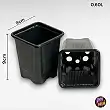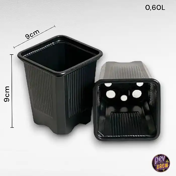 Maceta Esqueje 0.60L con unas dimensiones de 9x9x9 cm, óptima para germinar semillas y trasplantar esquejes recién enraizados, con diseño eficiente para drenaje y reutilizable