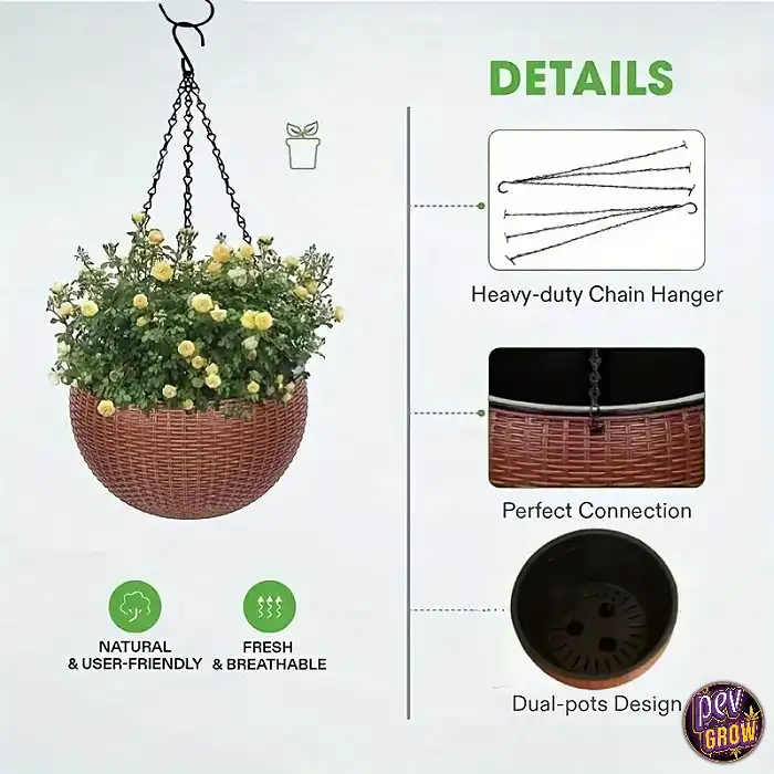 En Pevgrow, te ofrecemos este macetero colgante de auto riego imitación ratán para que disfrutes de la jardinería sin complicaciones. Es la solución perfecta para mantener tus plantas sanas y vibrantes con el mínimo esfuerzo. Si estás pensando en optimizar tu espacio de cultivo, no olvides revisar nuestros sistemas hidropónicos y aeropónicos para soluciones avanzadas de riego.