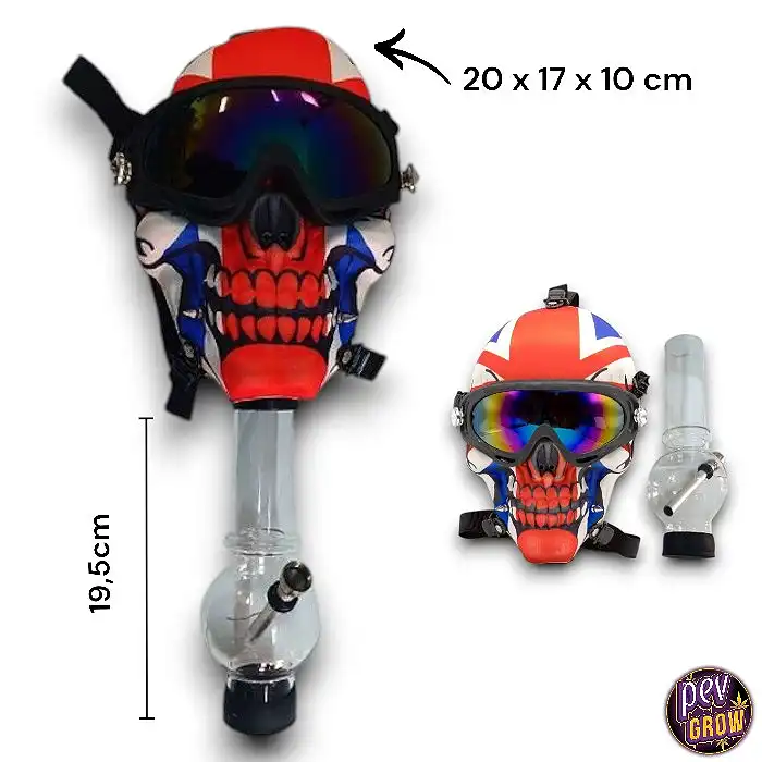 La Máscara de Gas Bong Plástico Calavera England , con su llamativo diseño de calavera y sistema cerrado, ofrece una experiencia de fumada intensificada. Correas ajustables y bong azul incluido para un estilo y sensación sin igual.