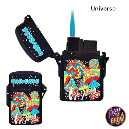 El Mechero Turbo Mushroom se presenta en cuatro diseños distintos: "Good Vibes", "Universe", "Let's take a trip" y "Trippin". Cada uno de ellos cuenta con una explosión de colores y elementos que evocan la cultura cannábica y psicodélica. No solo es un mechero, es una declaración de principios en tu mano. Además, su llama azul de alta intensidad es visible en cada encendido, demostrando la calidad y potencia del mechero.