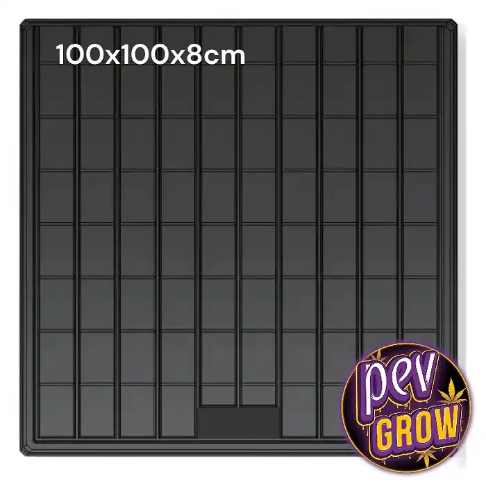 La Mesa de Cultivo-Bandeja 100x100 es una superficie plana y resistente diseñada específicamente para ser utilizada en los armarios o salas de cultivo. Su tamaño y forma están optimizados para maximizar el espacio y mejorar la gestión del riego de tus plantas de cannabis. Con sus esquinas fuertes y su superficie lisa pero con pequeñas canalizaciones, esta bandeja contiene una parte preparada para el desagüe, de esta forma se puede recoger todo el agua o solución nutriente evacuada. Su material plástico flexible, pero duradero, permite que la mesa se maneje con facilidad sin sacrificar su longevidad.