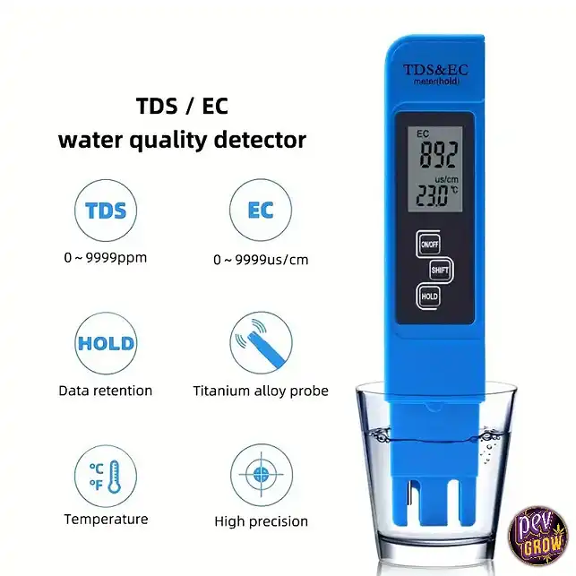 Ze meten hetzelfde (zoutconcentratie), maar in andere eenheden. EC meet elektrische geleidbaarheid (meestal in µS/cm of mS/cm), terwijl TDS de totale opgeloste stoffen schat (in ppm). De meeste voedingsgrafieken gebruiken EC, maar deze meter leest beide waarden.