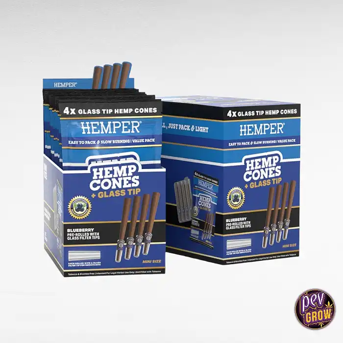 Los conos de cáñamo Hemper 1 1/4 con boquilla de cristal y sabor a blueberry ofrecen una combustión lenta y un sabor delicioso. Perfectos para disfrutar de tus hierbas legales con una experiencia de fumar limpia y suave.
