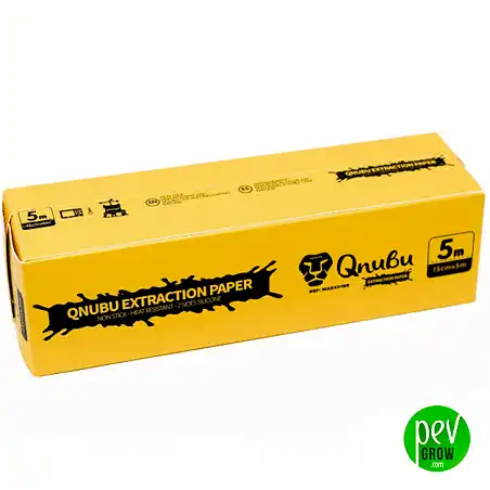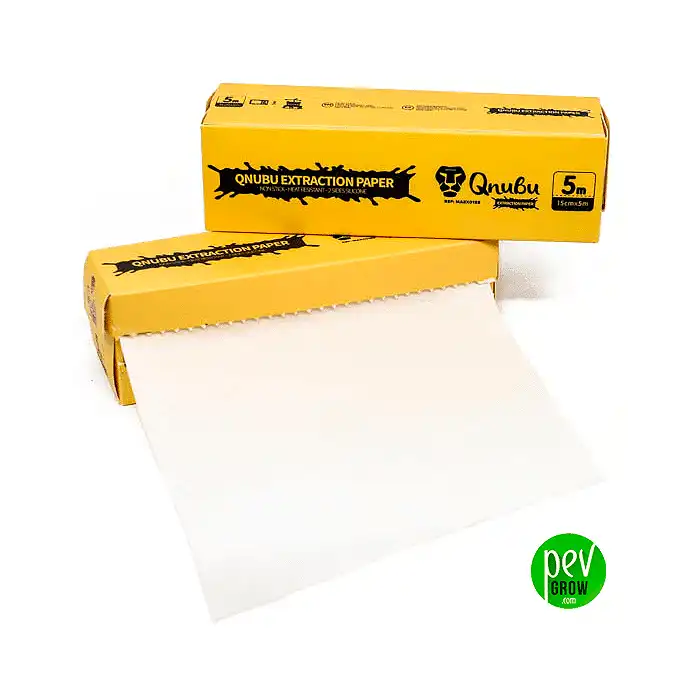 Se presenta enrollado y metido en una caja de cartón que contiene una parte aserrada para ayudar con el corte del papel, basta con sacar la cantidad necesaria y presionar sobre esa zona de corte para separar el trozo de papel que vayamos a utilizar. Normalmente se hace una especie de sobre con ese trozo de papel de Qnubu, doblando los bordes para que sólo quede una cara abierta, por esa apertura introducimos el cannabis metido en un filtro de Rosin y lo colocamos entre las placas calientes de la prensa de Rosin.