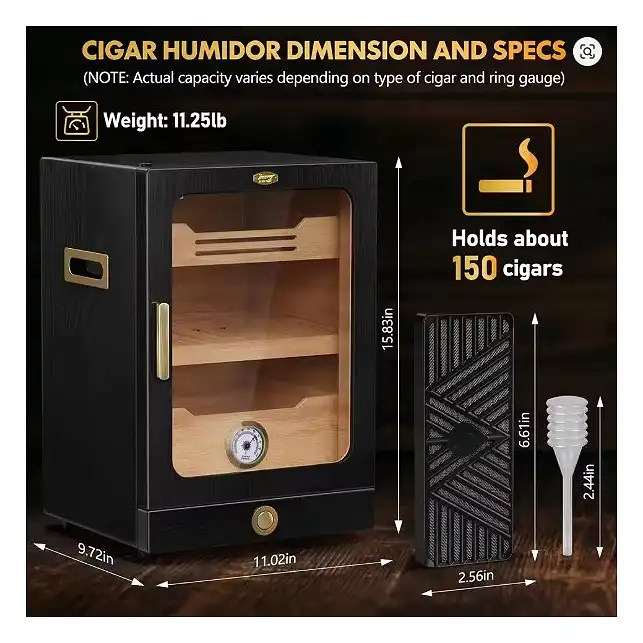 Pojemność zależy od vitoli (rozmiaru) cygar. Przy wymiarach 40x28x25 cm może pomieścić komfortowo od 75 do 100 sztuk, zapewniając odpowiednią cyrkulację powietrza.