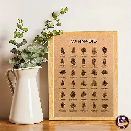 Este póster se distingue por su impresión de alta calidad y su diseño Art Deco, que resalta las siluetas y detalles de cada variedad de cannabis con un toque artístico. Al ser sin marco, te ofrece la libertad de elegir cómo exhibirlo, ya sea directamente en la pared, con un marco personalizado o como parte de una galería de arte. Su versatilidad lo hace apto para diversos entornos, desde un dormitorio juvenil hasta una cafetería con estilo.