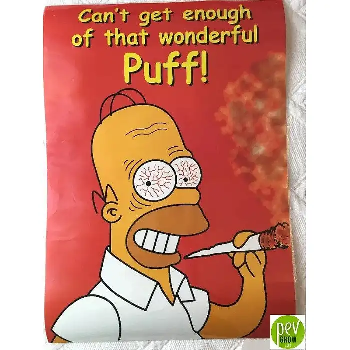 Poster original de Homer Simpson fumando hierba con los ojos rojos, una representación divertida del padre de familia más famoso en EEUU.