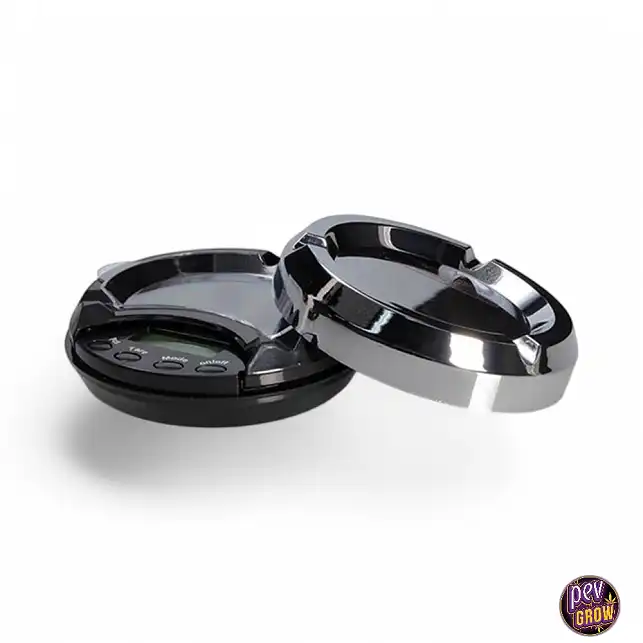 Este dispositivo é um exemplo de eficiência. À primeira vista, parece um cinzeiro comum e discreto, que se integra em qualquer decoração de sala. No entanto, ao remover a tampa, revela uma balança digital de qualidade profissional, capaz de pesar até 100 gramas com precisão de 0,01g. Substitui a necessidade de ter e armazenar [balanças para cannabis](https://pevgrow.com/en/1016-scales) e cinzeiros separados.