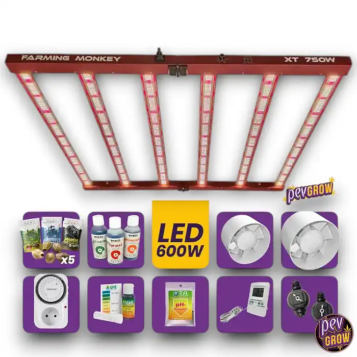 Este kit centra-se no LED Farming Monkey XT 750W—desenvolvido para eficiência máxima e desempenho na floração. Com díodos Samsung LM 281B Plus e um espectro rico em laranja e vermelho profundo (660nm), acelera a floração, produz inflorescências mais densas e aumenta a produção de resina. O seu design de 6 barras assegura uma distribuição uniforme da luz em 1m², enquanto o arrefecimento passivo em alumínio mantém o equipamento 100% silencioso—sem ventoinhas, sem ruído, sem distrações.
