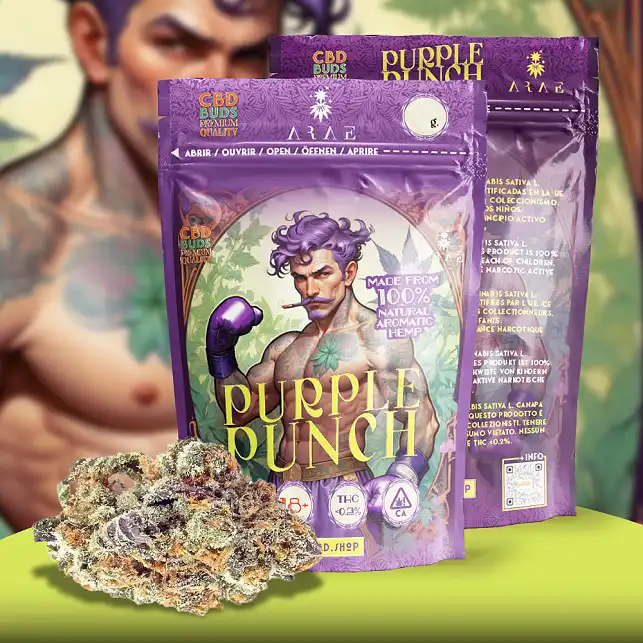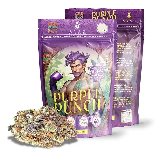 As Flores CBD Purple Punch são inflorescências premium de cânhamo cultivadas organicamente, repletas de terpenos frutados e doces e com até 20% de CBD — proporcionando um relaxamento profundo sem quaisquer efeitos psicoativos, graças a níveis de THC legalmente conformes, abaixo de 0,2%.
