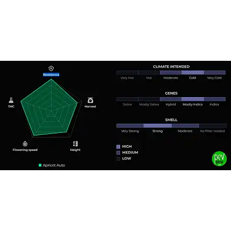 Antes da Apricot Auto, o seu sistema talvez parecesse um jogo de adivinhações — crescimento irregular, aromas fracos e colheitas que não correspondiam às descrições. Agora? Está no comando. Esta planta cresce compacta e robusta, raramente ultrapassando 1,20 m (3,94 pés), sendo perfeita para cultivos discretos ou tendas pequenas. O seu ciclo curto de 9–10 semanas significa que não terá de esperar meses pelos resultados. E quando chega a altura da colheita, será recebido com produções generosas de inflorescências cobertas de resina, coloridas e com um cheiro intenso de alperce maduro, que queimam suavemente com um sabor frutado e xaroposo.