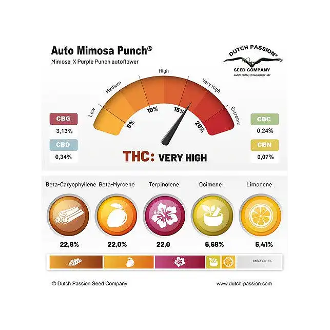 Auto Mimosa Punch da Dutch Passion é uma variedade autoflorescente super aromática que oferece um intenso impacto de sabor, aroma e potência em apenas 10–12 semanas, desde a semente até à colheita.