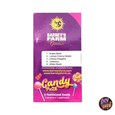 O pack inclui Cherry Poppers, Superboof, Jealousy, White Runtz e Lemon Cherry Gelato — todas feminizadas e cuidadosamente selecionadas pela Barney's Farm pelo seu sabor e potência.