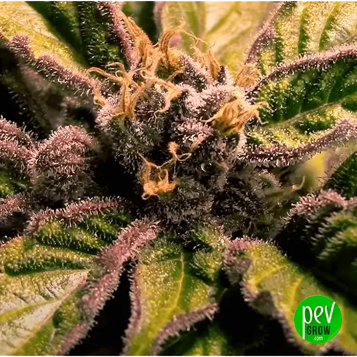Mude para luz 12/12 para iniciar a floração. Suporte a estrutura alta com LST ou grelha desde cedo. Na meio da floração, reduza a HR para 40–50% para prevenir mofo. Para flores densas e ricas em resina, Root Juice BioBizz potencia a floração e a produção de terpenos.
