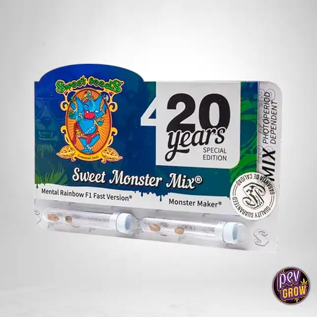 O Sweet Monster Mix® da Sweet Seeds é a sua porta de entrada para genética de elite em fotoperíodo, combinando Monster Maker® e Mental Rainbow F1 Fast Version® num pack exclusivo. Espere por THC elevado, perfis terpénicos complexos e produção abundante de resina destas duas variedades de qualidade superior.