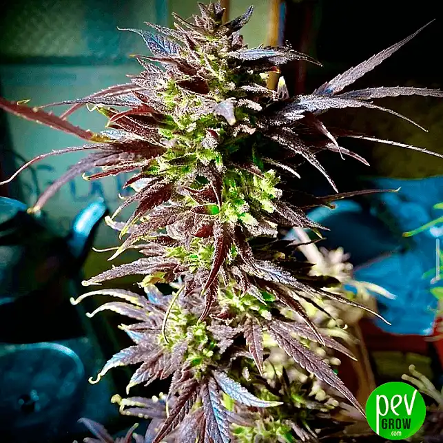 As tonalidades roxas desenvolvem-se com temperaturas noturnas mais baixas no final da floração. Se o ambiente permanecer quente, a planta pode manter-se verde. Isto não afeta a potência nem o efeito.