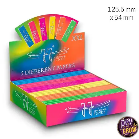 JaJa Funky Бумага для самокруток King Size XXL — это идеальный выбор для тех, кто не хочет идти на компромисс ни в размере, ни в стиле. Поверхность листа составляет 130 мм и изготовлена из ультратонкой рисовой бумаги. Этот продукт сочетает в себе универсальность, возможность скручивать значительно более крупные косяки с равномерным и медленным горением, а яркие цвета добавляют уникальный визуальный акцент каждой сессии.